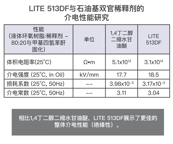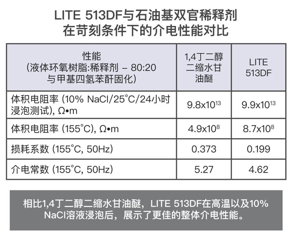 根據(jù)iec 62631和iec 60243標(biāo)準(zhǔn)進(jìn)行測試,如其介電性能所示,lite 513df提供了良好的絕緣性能。在epon 828的配方中,樹脂的使用量為20%,用mthpa(甲基四氫鄰二甲酸酐)固化,并用bdma(芐基二甲胺)催化。lite 513df展示了優(yōu)異的結(jié)果,其體積電阻率和介電強度更高,損耗因數(shù)和介電常數(shù)比競品1,4丁二醇二縮水甘油醚更低。當(dāng)兩種稀釋環(huán)氧樹脂體系都暴露于高溫或鹽溶液中時,lite 513df的性能優(yōu)于石油基雙官能稀釋劑。lite 513df是一款良好的環(huán)氧稀釋劑和改性劑,適用于電氣灌封、鑄造和封裝(浸漬樹脂)。